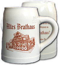Original Bierkrug "Altes Brathaus" 0,4l mit Schrift-zug und Motiv sowie dem Spruch: "Was ist schon ein Platz an der Sonne - gegen einen Sitzplatz im Alten Brathaus?"