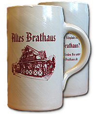 Neuer Original Bierkrug "Altes Brathaus" 0,4l mit Schriftzug und Motiv sowie dem Spruch: "Was ist schon ein Platz an der Sonne - gegen einen Sitzplatz im Alten Brathaus?"